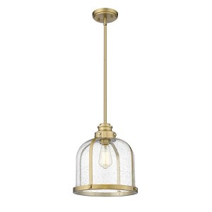 Add character to a dining or living space with this heritage brass finish one-light pendant. Seedy glass creates an ethereal domed shade that nestles in an industrial-inspired steel frame, offering an eye-catching design element. No. of Rods: 5 Cord Length: 110.00 Rod Length(s): 12.00 Dimmable: Yes Material: Steel, Finish Color: Heritage Brass, Width: 12.25", Height: 13.25", Length: 12.25", Lamping Type: Incandescent, Number Of Bulbs: 1, Wattage: 100 Watts, Dimmable: Yes, Moisture Rating: Damp Rated