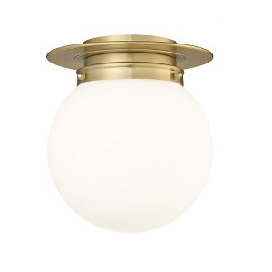 From the Calhoun collection comes a chic one-light flush mount mixing Mid-Century Modern and Schoolhouse motifs, delivering a clean artistic look in any application. This chic fixture stands out with a white glass globe attached to heritage brass steel framing and metal accents, creating a warming impact and a signature statement.