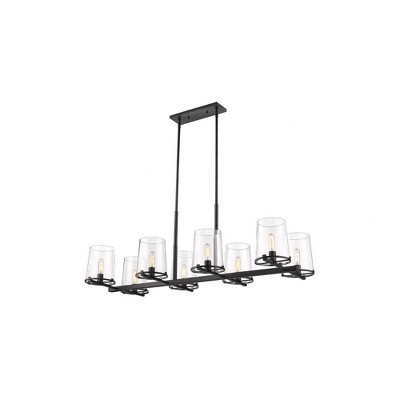 A virtual ring of elegance satisfies discerning tastes when the elegant Callista eight-light chandelier frames a dining ensemble, main living area, or entryway in a transitional to modern setting. This exceptional fixture creates a charming round silhouette formed with a handcrafted matte black finish steel frame and its wagon wheel silhouette, delivering a hint of industrial vibes. Tapered, clear glass shades filter ambient lighting and wrap up a list of high-energy yet easy-living features designed to impress. Cord Length: 170.00 Chain Length: 110.00 Dimmable: Yes Shade Included: Yes