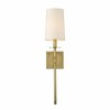 Long lines and an elegantly simple motif lend sophistication to this contemporary rubbed brass finish one-light wall sconce. Mirroring a traditional lamp motif, its steel frame and wall mount join a tall white fabric shade to form a decadent look with versatility for use in a bathroom, bedroom, or hallway. Bathroom/Powder Room/Bedroom/Hallway Shade Included: Yes Dimmable: Yes