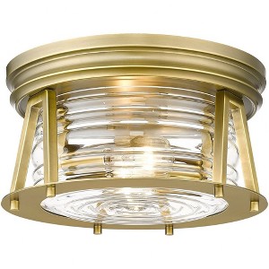 Indulge in a storied historical theme as you outfit a modern space with ambient light fixtures. Aptly named from the Cape Harbor collection, this delightful two-light flushmount ceiling light offers a tribute to authentic nautical fare from coastal Cape Harbor in North America, combining Art Deco flavor with a linear concept. This light offers an angled bronze finish frame and canopy that nestles ribbed clear glass, delivering an aesthetic that moves from industrial to modern to coastal. Dimmable: Yes Shade Included: Yes
