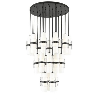 Create rich dimension and depth with the tiered design and linear framework of a modern 17-light chandelier. Three rows of lights create a spectacular display, each with a layered shade that begins with an etched opal glass cylinder, adds clear textured glass and is secured with a decorative cuff in a rich brushed nickel finish to match its canopy. Braided cloth cord covers complete the look with fresh elegance, perfect for an island pendant in your kitchen or over a dining table.