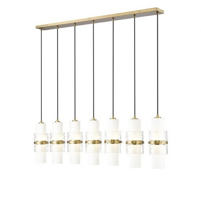 Cylindrical shades are arranged in a dizzying spiral to establish a superb silhouette for this modern seven-light chandelier. Perfect over a staircase or dining table, the chandelier features a brushed nickel finish canopy and decorative cuffs, which complement etched opal and clear textured glass cylinders that combine to create a stunning display.