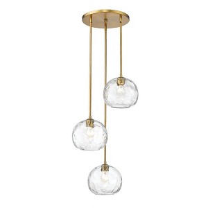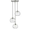 Define your modern space with the eye-catching, streamlined presence of this contemporary three-light pendant. Grooved, rounded shades are made from clear, water-textured glass, suspended from a sleek steel frame with a brushed nickel finish. Your contemporary dining room or family space gets an instant boost with this sophisticated fixture. Material: Glass, Finish Color: Brushed Nickel, Width: 20", Height: 30", Lamping Type: Incandescent, Number Of Bulbs: 3, Wattage: 100 Watts, Dimmable: Yes, Moisture Rating: Dry Rated