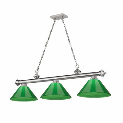 The elegant sheen of the finish and the delicate beauty of its glass shades make this three-light steel billiard light a glamorous addition to any modern home. Suspend this fashionable fixture over a kitchen island, dining table, or pool table to add a balanced aesthetic to interior decor. Room Recommendation: Game Room/Dining Room/Kitchen/Kitchenette Cord Length: 110.00 Chain Length: 72.00 Dimmable: Yes Shade Included: Yes