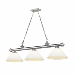 The elegant sheen of the finish and the delicate beauty of its glass shades make this three-light steel billiard light a glamorous addition to any modern home. Suspend this fashionable fixture over a kitchen island, dining table, or pool table to add a balanced aesthetic to interior decor. Room Recommendation: Game Room/Dining Room/Kitchen/Kitchenette Cord Length: 110.00 Chain Length: 72.00 Dimmable: Yes Shade Included: Yes