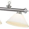 The elegant sheen of the finish and the delicate beauty of its glass shades make this three-light steel billiard light a glamorous addition to any modern home. Suspend this fashionable fixture over a kitchen island, dining table, or pool table to add a balanced aesthetic to interior decor. Room Recommendation: Game Room/Dining Room/Kitchen/Kitchenette Cord Length: 110.00 Chain Length: 72.00 Dimmable: Yes Shade Included: Yes