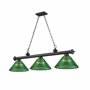 The elegant sheen of the finish and the delicate beauty of its glass shades make this three-light steel billiard light a glamorous addition to any modern home. Suspend this fashionable fixture over a kitchen island, dining table, or pool table to add a balanced aesthetic to interior decor. Room Recommendation: Game Room/Dining Room/Kitchen/Kitchenette Cord Length: 110.00 Chain Length: 72.00 Dimmable: Yes Shade Included: Yes