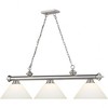 The elegant sheen of the finish and the delicate beauty of its glass shades make this three-light steel billiard light a glamorous addition to any modern home. Suspend this fashionable fixture over a kitchen island, dining table, or pool table to add a balanced aesthetic to interior decor. Room Recommendation: Game Room/Dining Room/Kitchen/Kitchenette Cord Length: 110.00 Chain Length: 72.00 Dimmable: Yes Shade Included: Yes