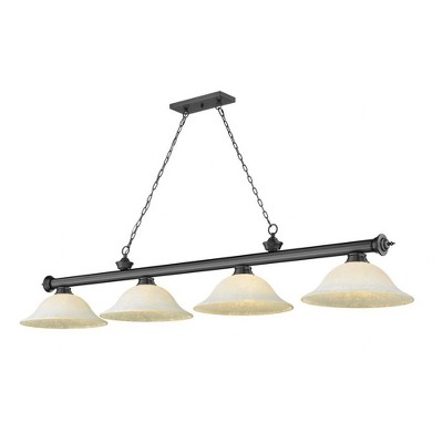 The alluring gleam of the finish and the delicate beauty of its glass shades makes this traditional, four-light metal billiard light an attractive addition to any home. Perfect for kitchens, game rooms, and dining rooms, this effortlessly stylish fixture breathes new life into everyday home decor. Room Recommendation: Game Room/Dining Room/Kitchen/Kitchenette Cord Length: 110.00 Chain Length: 72.00 Dimmable: Yes Shade Included: Yes