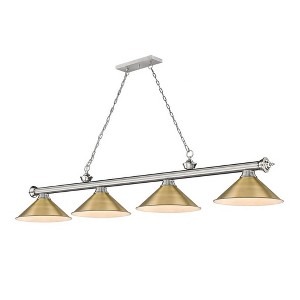 The alluring gleam of the finish and the delicate beauty of its glass shades makes this traditional, four-light metal billiard light an attractive addition to any home. Perfect for kitchens, game rooms, and dining rooms, this effortlessly stylish fixture breathes new life into everyday home decor. Room Recommendation: Game Room/Dining Room/Kitchen/Kitchenette Cord Length: 110.00 Chain Length: 72.00 Dimmable: Yes Shade Included: Yes