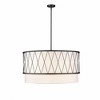 A lovely addition to open concept living rooms, spacious master bedrooms and dining rooms, this modern five-light pendant boasts a diamond shaped motif across the brushed nickel wire cage, creating a chic retro-inspired touch. A white fabric shade casts a serene and soothing glow that contrasts against the lustrous metallic cage and ceiling mount, adding to the dimension of the tiered round drum design.