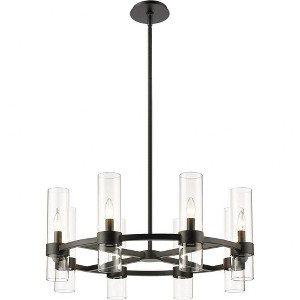 Distinctive modern style takes a page from industrial-inspired flavor, creating a captivating fixture blending matte black steel and glass. With a circular spoke-style frame, the Datus eight-light chandelier lends a minimalist approach to lighting with enough glam to stand out. Perfect for a small- to mid-sized contemporary dining room, kitchen, or hallway, this chandelier delivers drama with a round frame crafted of bold matte black finish iron, dressed up with delicate clear glass cylinder shades. Cord Length: 110.00 Rod Length(s): 1-3, 1-6, 6-12 Dimmable: Yes Shade Included: Yes