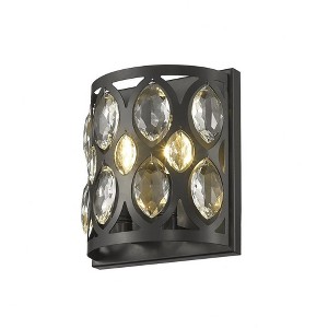 Exquisite and glamorous, this two-light wall sconce from the Dealey collection is the perfect addition to a contemporary home foyer or hallway between rooms. Featuring a matte black steel shade, complete with alluring ellipse-shaped cut outs set with shimmering clear crystal droplets, this wall sconce lends a dramatic, contrasting look. With two candelabras nestled behind the crystals, this flush mount sconce also acts as accent lighting, creating a wonderful fractalized glow along the walls and footpath. Bathroom/Powder Room/Bedroom/Hallway Shade Included: Yes Dimmable: Yes
