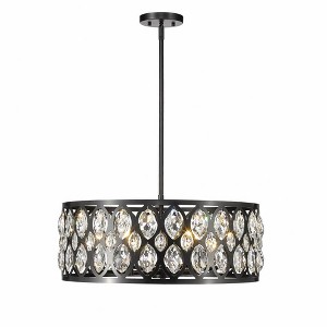 From the Dealey collection comes this elegant, round six-light chandelier. Featuring a striking ellipse-carved steel shade circling each of the six candelabras, this chandelier also features a dark matte black finish that accentuates the dangling, shimmering clear crystal pendants that disperse the light. Hang this alluring chandelier above a contemporary dining room table to lend a traditional touch. Dining Room/Foyer/Great Room/Hallway/Kitchen No. of Rods: 7 Shade Included: Yes Cord Length: 110.00 Rod Length(s): 12.00 Dimmable: Yes