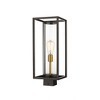 From the Dunbroch collection comes this elegant, contemporary outdoor post mount, ideal for patio decks and railings. With an open and airy rectangular aluminum lantern, this post mount fixture features a single light fixture in a warm outdoor brass finish, and is sheathed inside a transparent tube-like glass globe that allows the light to disperse evenly across pathways and seating areas. This outdoor light fixture also features a timeless deep bronze finish that suits existing building facade materials and colors schemes. Outdoor Living/Deck/Patio Shade Included: Yes Dimmable: Yes