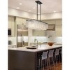 Sensory perception reflects a glam feel with minimalism driving its narrative, turning this seven-light island light into a premier fixture. The Glacier island light offers a decadent look of individual textured glass panels that emulate melting ice, an extraordinary effect with dramatic impact in a kitchen or bar space. Matte black finish steel creates a bold frame and canopy, adding a contrast in both style and finish, embellishing the optical delight accomplished when the fixture is illuminated.