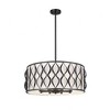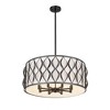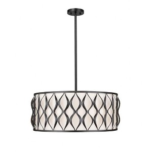 Timeless artistry and symmetry brings an exquisite vibe to this eight-light pendant, a classic fixture with plenty of versatility and construction of bold matte black steel. A drum silhouette is aesthetically pleasing as this fixture offers artisan ribbon waves cascading vertically down its banded frame, and a soft white fabric diffuser maintains pleasing lighting effects. Candelabra-style lights and a round canopy complete a checklist of features that round out an iconic look in a pendant that adds elegance to kitchens, foyers, and dining spaces.