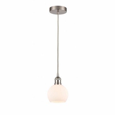Finished in brushed nickel, this one light fixture uses a white circular shade to create a fun contemporary statement. 108 of clear cord is included to ensure a perfect hanging height. Bedroom/Dining Room/Dinette/Kitchen/Kitchenette Shade Included: Yes Cord Length: 110.00 Dimmable: Yes Material: Steel, Finish Color: Brushed Nickel, Width: 5", Height: 8", Lamping Type: Incandescent, Number Of Bulbs: 1, Wattage: 60 Watts, Dimmable: Yes, Moisture Rating: Dry Rated