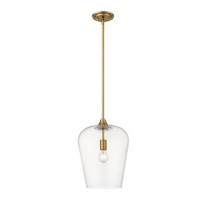 Designed with sleek metal lines and an elegant silhouette, this brushed nickel pendant is a stunning home decor upgrade. This single-light fixture features a clear glass shade for a magnificent display of light. Material: Glass, Finish Color: Brushed Nickel, Width: 12", Height: 16.25", Lamping Type: Incandescent, Number Of Bulbs: 1, Wattage: 100 Watts, Dimmable: Yes, Moisture Rating: Dry Rated
