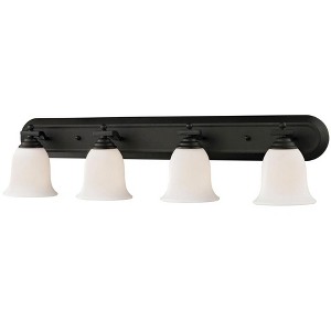 A gorgeous set of four vanity lights in matte black finish and matte opal frosting. Bathroom/Powder Room Mounting Direction: Up/Down Shade Included: Yes Dimmable: Yes Material: Glass, Finish Color: Matte Black, Width: 36", Height: 8", Length: 7", Depth: 7", Backplate Width: 4.75", Backplate Length: 36", Lamping Type: Incandescent, Number Of Bulbs: 4, Wattage: 100 Watts, Dimmable: Yes, Moisture Rating: Damp Rated