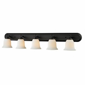 A gorgeous set of five vanity lights in matte black finish and matte opal frosting. Bathroom/Powder Room Mounting Direction: Up/Down Shade Included: Yes Dimmable: Yes Material: Glass, Finish Color: Matte Black, Width: 48", Height: 8", Length: 7", Depth: 7", Backplate Width: 4.75", Backplate Length: 48", Lamping Type: Incandescent, Number Of Bulbs: 5, Wattage: 100 Watts, Dimmable: Yes, Moisture Rating: Damp Rated