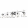 Designed to span a generous vanity, this modern five-light vanity wall light is an intriguing addition with soothing, spa-like energy. Delivering a precise, clean look and feel, the sconce pairs flared, clear glass shades with linear framework in a crisp brushed nickel finish. Steel construction ensures reliability for a fixture that may be mounted with its lights pointing up or down.