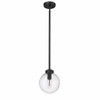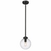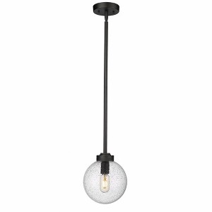 Mid-Century Modern attitude creates retro inspiration in a fixture that dazzles in an outdoor space. Light up a deck or patio with this cheery one-light outdoor pendant reflecting a hint of storied village nautical attitude. Suspending from a black finish aluminum canopy and down rod, its chic, delicate clear seedy glass globe delivers the ultimate in sophistication.