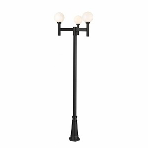 Iconic village fare reflects Mid-Century Modern vibes in an exterior setting, completing a tasteful, decorative effect. The Laurent three-light outdoor post mounted fixture offers a charming aesthetic with a contrasting palette and whimsical design. Crafted of black finish aluminum, its post and frame delivers stellar versatility and a sleek look. Three charming opal glass globes put a retro stamp with festive artistry on this outdoor fixture.