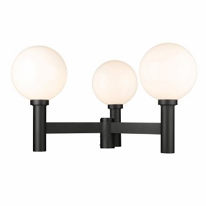 Festive signs of Mid-Century Modern vibes introduce a whimsical aesthetic in exterior garden and walkway areas. From the Laurent collection comes a three-light outdoor post-mount fixture offering a retro-influenced motif and a dose of Art Deco attitude. Dressed up with three opal white glass globe shades and cylindrical black finish aluminum elements, this post mount fixture delivers eye-catching palette contrast.