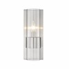 Sleek and minimal, this linear modern wall sconce illuminates a bathroom vanity or powder room with its understated sophistication. A steel plate holds a lantern-like clear glass tube that presents an exposed bulb, clasped by a wide brushed nickel ring that gives off a metallic touch, complementing bathroom hardware and fixtures. With its slender shape and design, this contemporary one-light wall sconce makes itself at home, flanked beside a mirror illuminating countertops and dressing areas.