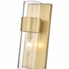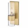 Sleek and minimal, this linear modern wall sconce illuminates a bathroom vanity or powder room with its understated sophistication. A steel plate holds a lantern-like clear glass tube that presents an exposed bulb, clasped by a wide brushed nickel ring that gives off a metallic touch, complementing bathroom hardware and fixtures. With its slender shape and design, this contemporary one-light wall sconce makes itself at home, flanked beside a mirror illuminating countertops and dressing areas.