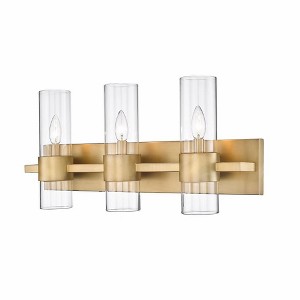 Minimalist modern style carries through in this chic linear contemporary vanity light, transforming en suite bathrooms and spacious powder room into a sleek and restful retreat. An elongated steel plate suspends three lantern-like clear glass cylinder shades, each held in place by a wide brushed nickel ring that adds a luxe metallic touch. Mirror existing bathroom hardware and fixtures and create substantial illumination with this three-light vanity light, mounting it above a decorative bathroom mirror over a countertop or dressing area.