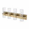 Create a chic minimalist expression with this linear contemporary vanity light, transforming en suite bathroom retreats into a tastefully adorned dressing area. This four-light vanity fixture presents an elongated steel plate in a shiny brushed nickel finish that suspends four lantern-like clear glass cylinder shades held in place by a wide band in the same finish, creating a metallic touch to a bathroom space. Match existing bathroom hardware and fixtures effortlessly and illuminate the space with this stunning and sophisticated modern vanity light, placing it over a spacious countertop or full-length wall mirror.
