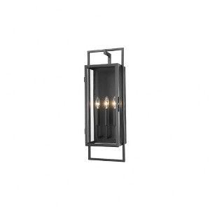 With a noticeable nod to contemporary style, this energetic exterior fixture offers a superb complement to updated spaces. The Lucian three-light outdoor wall sconce builds on a box-inspired base with an extra open base, showcasing an alignment of three candelabra style bulbs. Clear glass serves as an unobtrusive shield protecting bulbs, as bold black finish steel construction delivers a commanding presence. Dimmable: Yes Shade Included: Yes
