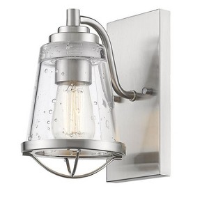 Inspired by nautical themes, the Mariner collection of fixtures uses specially crafted seedy glass shades and pairs them with bold metal trim and detailing. Vintage bulbs are included to complete this unique look, and finishes include Brushed Nickel and Bronze Bathroom/Powder Room/Bedroom/Hallway Mounting Direction: Up/Down Shade Included: Yes Dimmable: Yes Material: Steel, Finish Color: Brushed Nickel, Width: 5.5", Height: 9.125", Length: 7.625", Depth: 7.63", Backplate Width: 9", Backplate Length: 4.5", Lamping Type: Incandescent, Number Of Bulbs: 1, Wattage: 100 Watts, Dimmable: Yes, Moisture Rating: Damp Rated