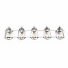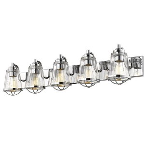 At the center of a contemporary, stylish bath space lies this personality-rich five-light vanity fixture. Indulge in a charming maritime theme that marries sleek chrome finish steel and seedy glass shades, with a dose of ornate metal trim. Bathroom/Powder Room Mounting Direction: Up/Down Shade Included: Yes Dimmable: Yes Material: Steel, Finish Color: Chrome, Width: 40", Height: 8.875", Length: 7.625", Depth: 7.63", Backplate Width: 4.5", Backplate Length: 40", Lamping Type: Incandescent, Number Of Bulbs: 5, Wattage: 100 Watts, Dimmable: Yes, Moisture Rating: Damp Rated