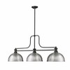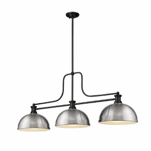 A subtle industrial vibe and brushed nickel and matte black finish pairing flatter this three-light billiards pendant from the Mélange collection by Z-Lite. A simple yet fluid silhouette blends matte black steel and dome-shaped brushed nickel steel shades forming a perfectly balanced profile. This charming fixture is an ideal solution to brighten a kitchen island or sports room billiard space.