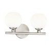 Make modern style work in an updated bath space with this two-light vanity light from the Neoma collection. Symmetry and a hint of festive retro influence blend to add an outspoken design aesthetic featuring side-by-side opal etched glass globe shades affixed to a minimalist frame made of brushed nickel finish steel. This contemporary vanity light transforms a master ensuite or guest bath into a haven for style.