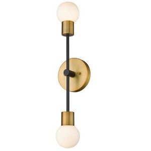 This stylish two-light wall sconce from the Neutra collection lends a mid-century modern flair with a subtle Art Deco vibe. Ideal for a contemporary master suite, this dual pendant wall sconce features a steel structure, complete with polished foundry brass and matte black finishes. In addition, this wall sconce lends a soft, soothing glow with its two stacked opal globes. Bathroom/Powder Room/Bedroom/Hallway Mounting Direction: Up/Down Shade Included: Yes Dimmable: Yes