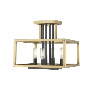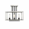 Create a stylish aesthetic in a modern space with this sleek brushed nickel finish four-light ceiling light. Its semi-flushmount build works well in lower ceilings, offering an enticing view of an open geometric steel frame hosting black finish vertical rods and candelabra-style bulb bases. Material: Steel, Finish Color: Brushed Nickel/Black, Width: 12", Height: 12", Length: 13", Lamping Type: Incandescent, Number Of Bulbs: 4, Wattage: 60 Watts, Dimmable: Yes, Moisture Rating: Dry Rated