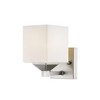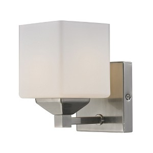 Rectangular shaped hardware and a complimenting cube shade create a straight contemporary look. This wall sconce is finished in brushed nickel, and includes a matte opal shade. This fixture will add a touch of contemporary to any decor. Bathroom/Powder Room Mounting Direction: Up/Down Shade Included: Yes Dimmable: Yes Material: Glass, Finish Color: Brushed Nickel, Width: 4.25", Height: 6.75", Length: 6", Depth: 6", Backplate Width: 4.25", Backplate Length: 4.25", Lamping Type: Incandescent, Number Of Bulbs: 1, Wattage: 100 Watts, Dimmable: Yes, Moisture Rating: Damp Rated