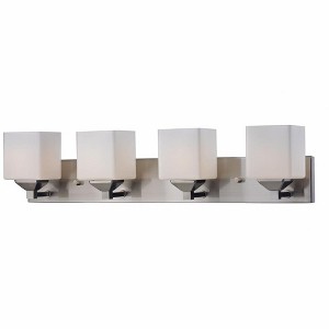 Rectangular shaped hardware and complimenting cube shades create a straight contemporary look. This four light vanity is finished in brushed nickel, and includes matte opal shades. This fixture will add a touch of contemporary to any decor. Bathroom/Powder Room Mounting Direction: Up/Down Shade Included: Yes Dimmable: Yes Material: Glass, Finish Color: Brushed Nickel, Width: 30", Height: 6.75", Length: 6", Depth: 6", Backplate Width: 4.25", Backplate Length: 30", Lamping Type: Incandescent, Number Of Bulbs: 4, Wattage: 100 Watts, Dimmable: Yes, Moisture Rating: Damp Rated
