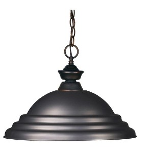 This one light pendant's hardware is finished in olde bronze and paired beautifully with stepped olde bronze metal shades. Game Room Shade Included: Yes Cord Length: 110.00 Dimmable: Yes Material: Steel, Finish Color: Olde Bronze, Width: 16", Height: 10", Chain Length: 72", Lamping Type: Incandescent, Number Of Bulbs: 1, Wattage: 150 Watts, Dimmable: Yes, Moisture Rating: Dry Rated