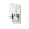 Bold contemporary style gives this mid-century modern one-light wall sconce sophisticated elegance. A chrome finish underscores the luminous brightness of the clear glass cylinder-shaped shade. Bathroom/Powder Room/Bedroom/Hallway Mounting Direction: Up/Down Shade Included: Yes Dimmable: Yes Material: Glass, Finish Color: Brushed Nickel, Width: 4.5", Height: 10.25", Length: 5.5", Depth: 5.5", Backplate Width: 10.25", Backplate Length: 4.5", Lamping Type: Incandescent, Number Of Bulbs: 1, Wattage: 100 Watts, Dimmable: Yes, Moisture Rating: Damp Rated