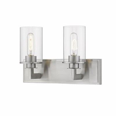 A mid-century modern sense of simplicity gives this five-light vanity a chic sleekness. The luminous brightness of the clear glass cylinder shades is brilliantly highlighted by the chrome finish. Bathroom/Powder Room Mounting Direction: Up/Down Shade Included: Yes Dimmable: Yes Material: Glass, Finish Color: Brushed Nickel, Width: 38.75", Height: 10.25", Length: 5.5", Depth: 5.5", Backplate Width: 4.5", Backplate Length: 38.75", Lamping Type: Incandescent, Number Of Bulbs: 5, Wattage: 100 Watts, Dimmable: Yes, Moisture Rating: Damp Rated