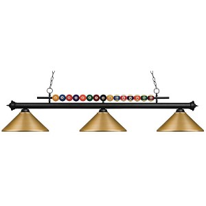 Playful pool ball motifs best describe this beautiful three light fixture. Finished in brushed nickel and paired with satin gold shades, this three light fixture would be at home in the game room. 72 inches of chain per side is included to ensure the perfect hanging height. Game Room/Dining Room/Kitchen/Kitchenette Shade Included: Yes Cord Length: 110.00 Dimmable: Yes