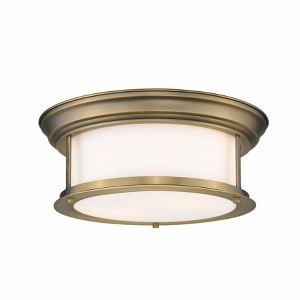 Let classic design create sophistication in a larger transitional living space. A wide cylindrical clear seedy glass shade nested in an open metal frame with a sleek Heritage Brass finish forms a stylish yet functional solution to lighting challenges. Bedroom/Dining Room/Foyer/Hallway/Kids Room/Kitchen/Living Room/Office/Utility Room Shade Included: Yes Dimmable: Yes Material: Steel, Finish Color: Heritage Brass, Width: 13.5", Height: 5.5", Hanging Method: Flush, Lamping Type: Incandescent, Number Of Bulbs: 2, Wattage: 60 Watts, Dimmable: Yes, Moisture Rating: Dry Rated