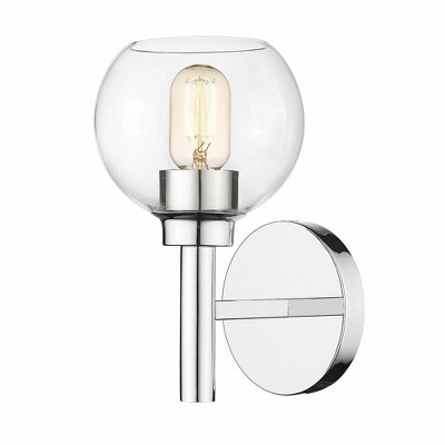 A contemporary two-light vanity sconce boasts graceful curves that create its perfect circle design elements. Its familiar, torch-inspired silhouette is adorned with a brushed gold finish for warm, glamorous flair in an entry or bathroom. A pair of open-edged, clear glass globe shades adds precision, and this fixture can be mounted with lights either up or down to best suit your space and preference.