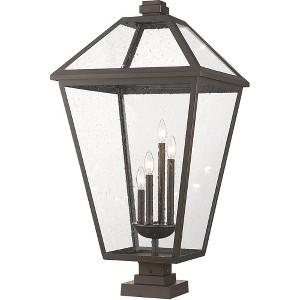 A transitional-style frame with bold glass panels make this a truly timeless collection. Offered in wall mount, pendants and even post lights, the Talbot family is available in two finishes, Midnight Black with Clear beveled glass panels or Rubbed Bronze with Seeded Glass Panels. Room Recommendation: Outdoor Living/Deck/Patio Dimmable: Yes Shade Included: Yes